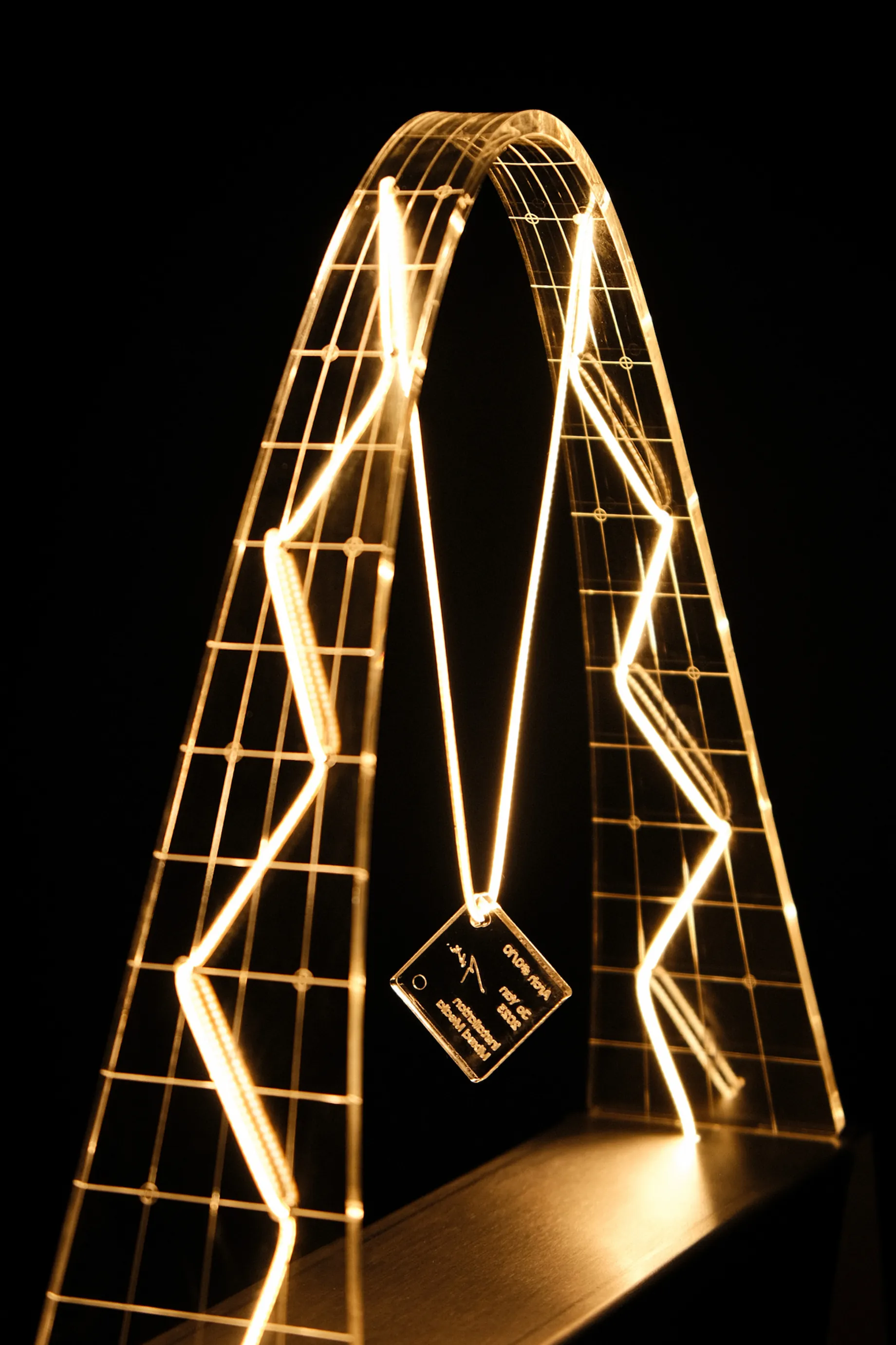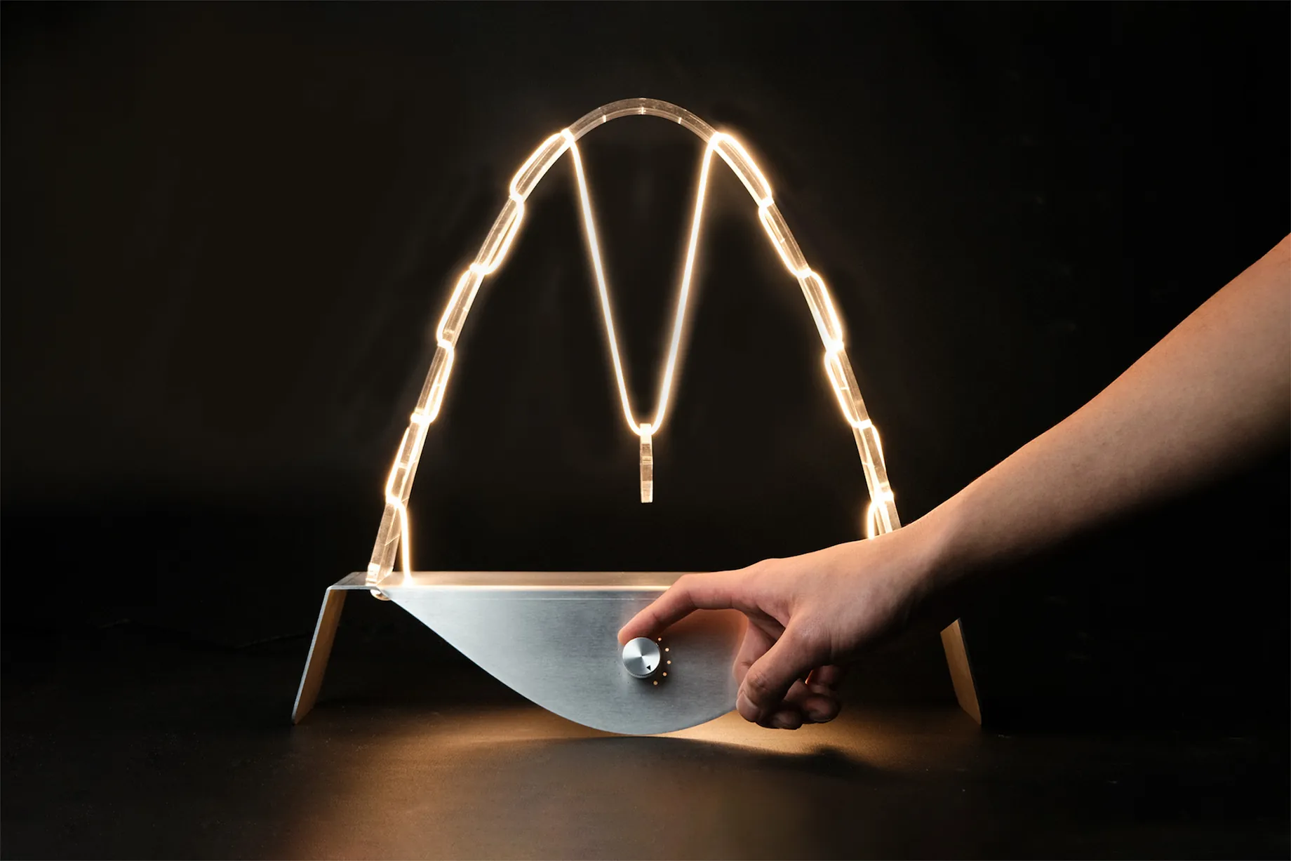 How can novel technology speak to nostalgia? In Arch, a flexible LED filament (nOOds) dances through an acrylic parabola, recreating your favorite childhood swing. The bent sheet aluminum base, the heat-formed acrylic frame, and the minimized circuitry gather and bring a democratic sensual experience.