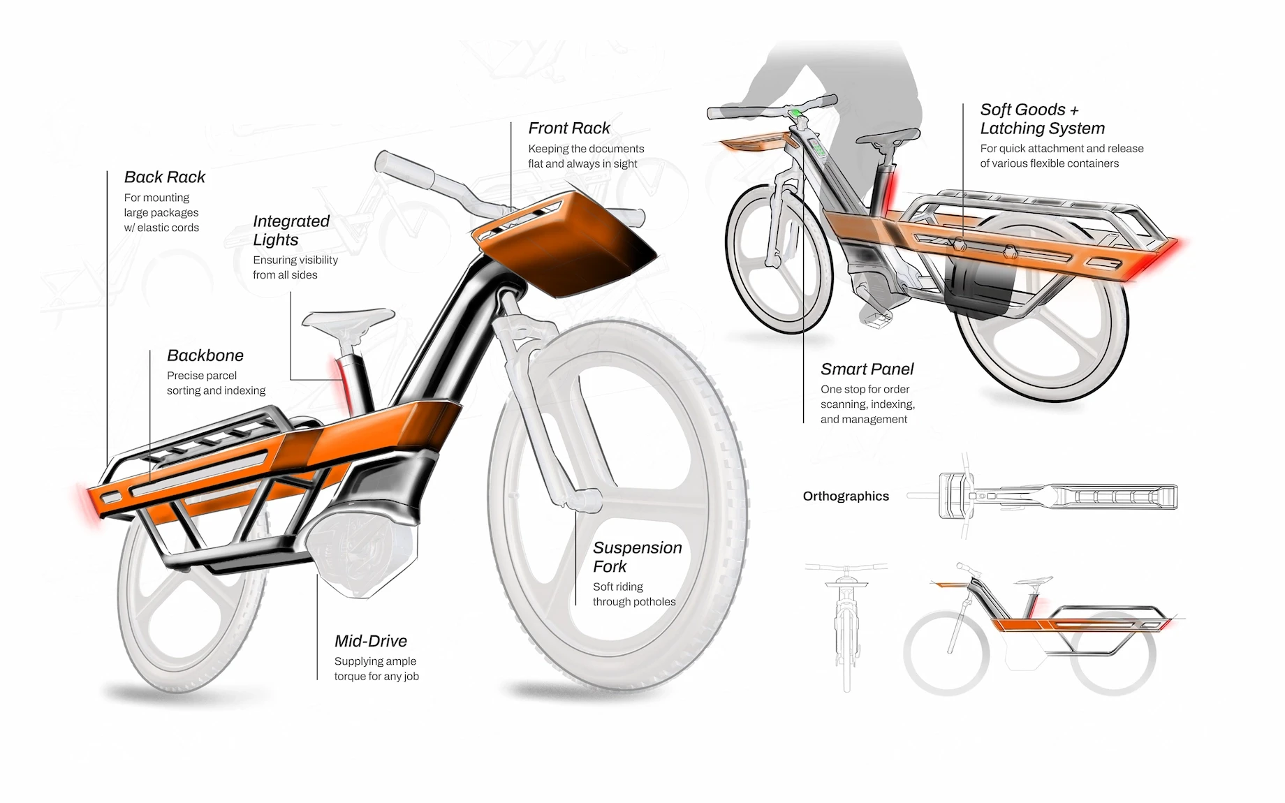 As an e-bike purposefully designed for delivery, the Mercuri concept addresses all four primary pain points found in research through systems of physical and electronic features.