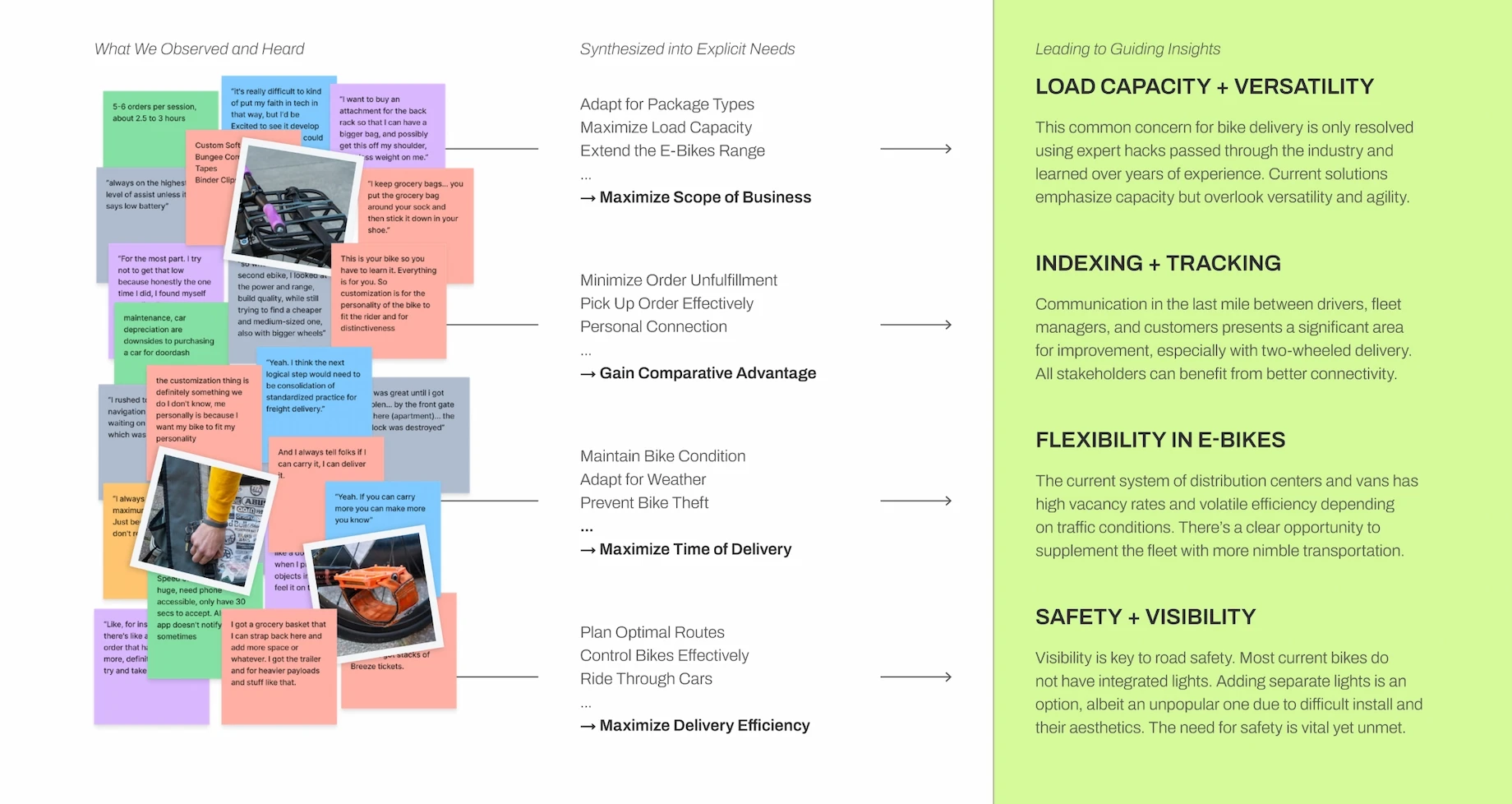 Our team reached out to 30+ delivery professionals from bike couriers to appbased delivery drivers. Through affinity mapping and why/how ladders, we identified four key pain points and opportunities within the current delivery ecosystem.